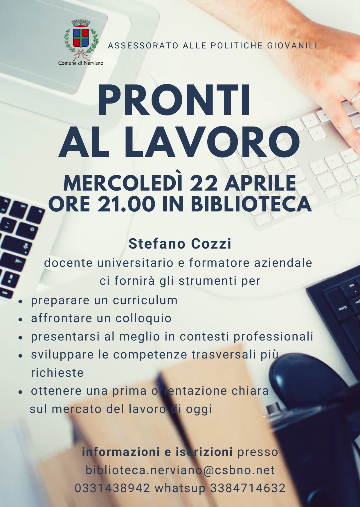 Mercoledì 22 aprile alle ore 21:00 in biblioteca, il docente universitario e formatore aziendale Stefano Cozzi ci fornirà gli strumenti per preparare un curriculum, affrontare un colloquio, presentarsi al meglio in contesti professionali, sviluppare le competrenze trasversali più richieste e ottenere un primo orientamento sull'attuale mercato del lavoro.