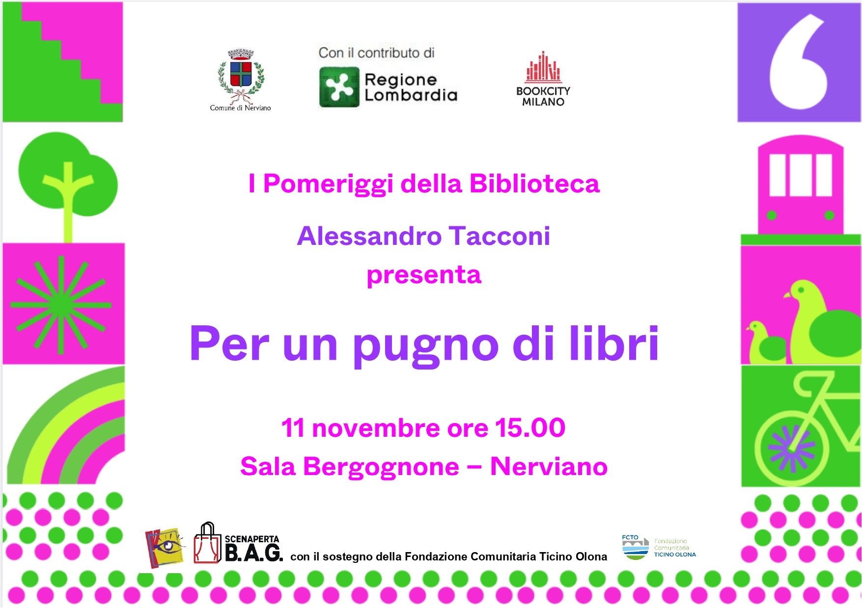 Martedì 11 novembre alle 15.00 in Sala Bergognone PER UN PUGNO DI LIBRI con Alessandro Tacconi. Se una sera un lettore appassionato, compulsivo, onnivoro giungesse nella vostra città con una valigia strabordante di libri? Se quel viaggiatore e lettore non vedesse l’ora di condividere con voi trame, aneddoti, personaggi dei libri che ritiene più importanti e suggestivi? Vogliamo solleticare e sollecitare il pubblico, accennando trame, mostrando relazioni tra un libro e l’altro, proponendo ascolti inediti.