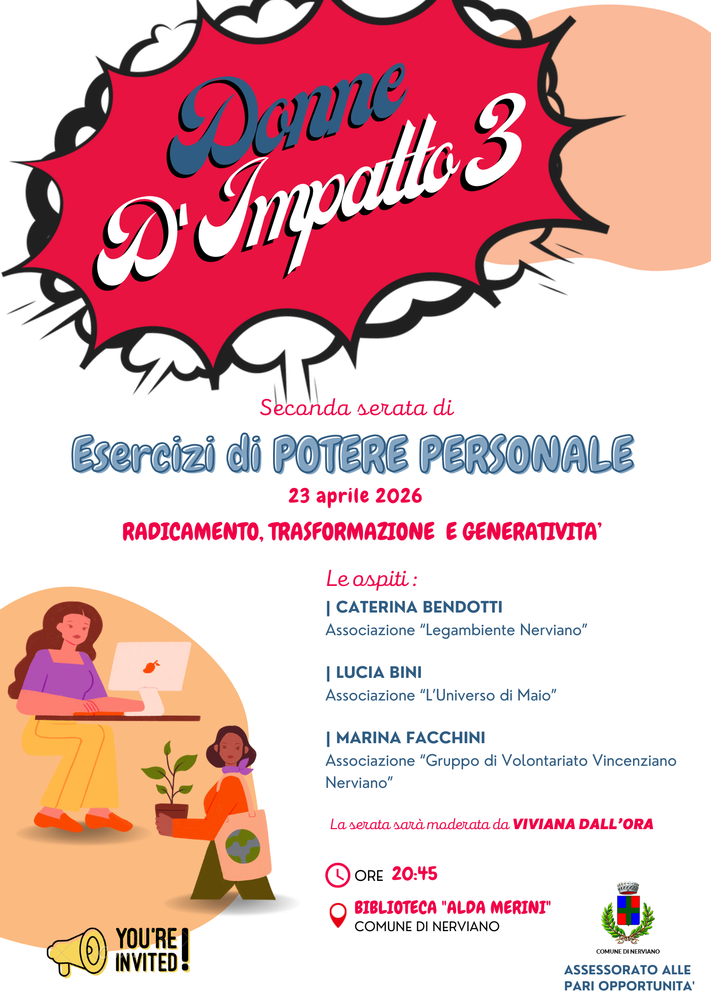 Giovedì 23 aprile 2026 alle ore 20.45, presso la Biblioteca Civica A. Merini, si terrà la seconda serata del ciclo di incontri "Donne d'impatto", promosso dall'Assessorato alle Pari Opportunità. L’edizione di questa primavera si sviluppa attorno a tre parole chiave – tradizione, innovazione e generatività – prospettive diverse ma profondamente connesse, capaci di raccontare il presente e immaginare il futuro del territorio.
