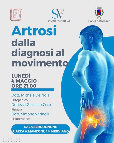 Terzo appuntamento organizzato dall'associazione "Facciamo Quadrato", dedicato alla salute e al benessere di diverse fasce di età, dal titolo "Artrosi - dalla diagnosi al movimento" che si svolgerà lunedì 04 maggio alle ore 21.00 presso la Sala Bergognone a Nerviano.