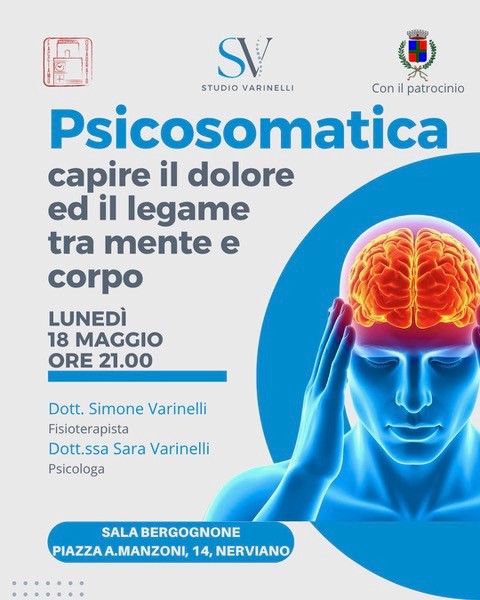 Quarto e ultimo appuntamento organizzato dall'associazione "Facciamo Quadrato", dedicato alla salute e al benessere di diverse fasce di età, dal titolo "Psicomatica - Capire il dolore ed il legame tra mente e corpo" che si svolgerà lunedì 18 maggio alle ore 21.00 presso la Sala Bergognone a Nerviano.