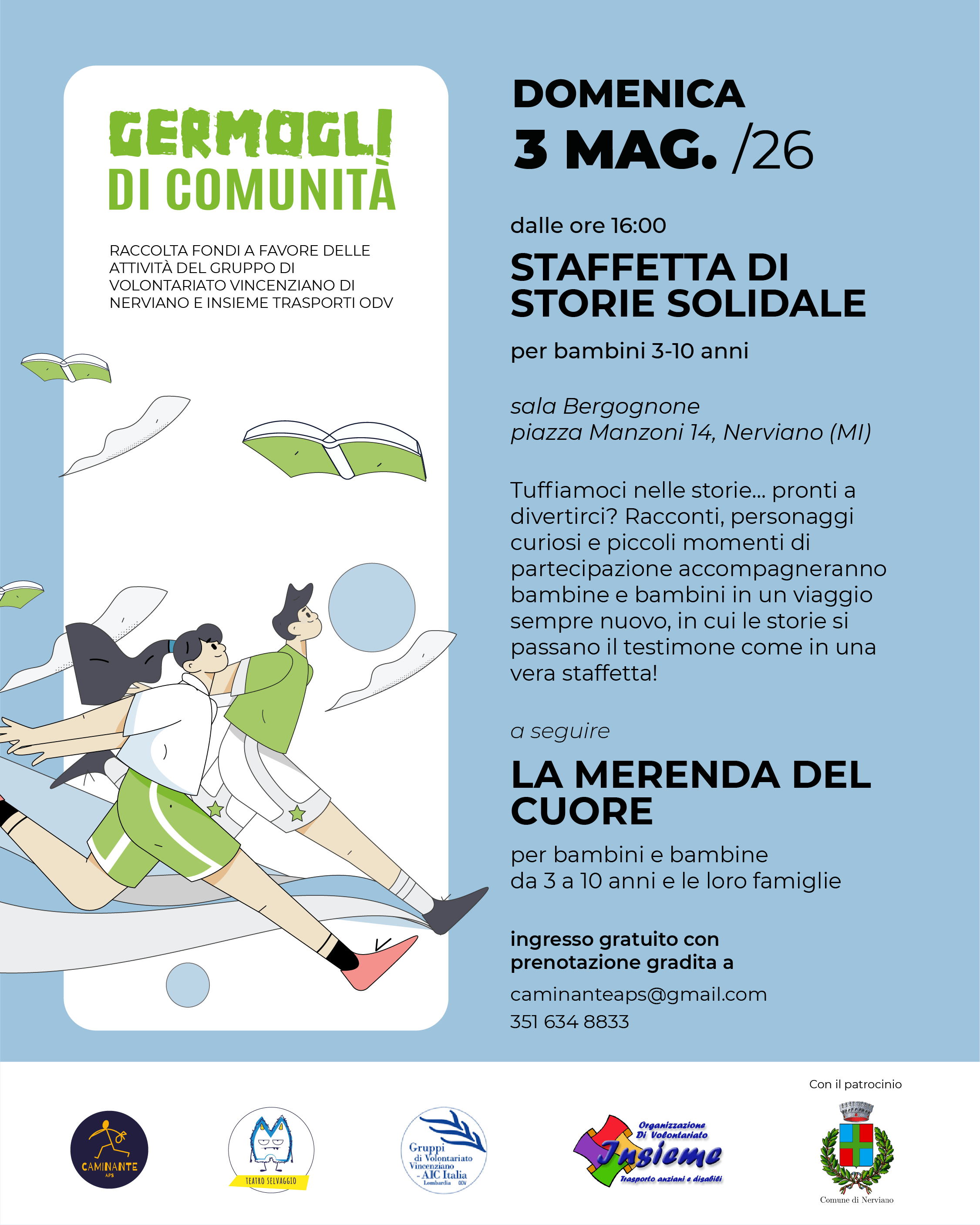 I bambini e le bambine da 3 a 10 anni potranno divertirsi partecipando alla staffetta solidale di storie, un viaggio in cui le storie si passano il testimone come in una vera staffetta; a seguire la merenda del cuore per i bambini e le bambine con le loro famiglie (dalle ore 16:00 in Sala Borgognone piazza Manzoni 14).