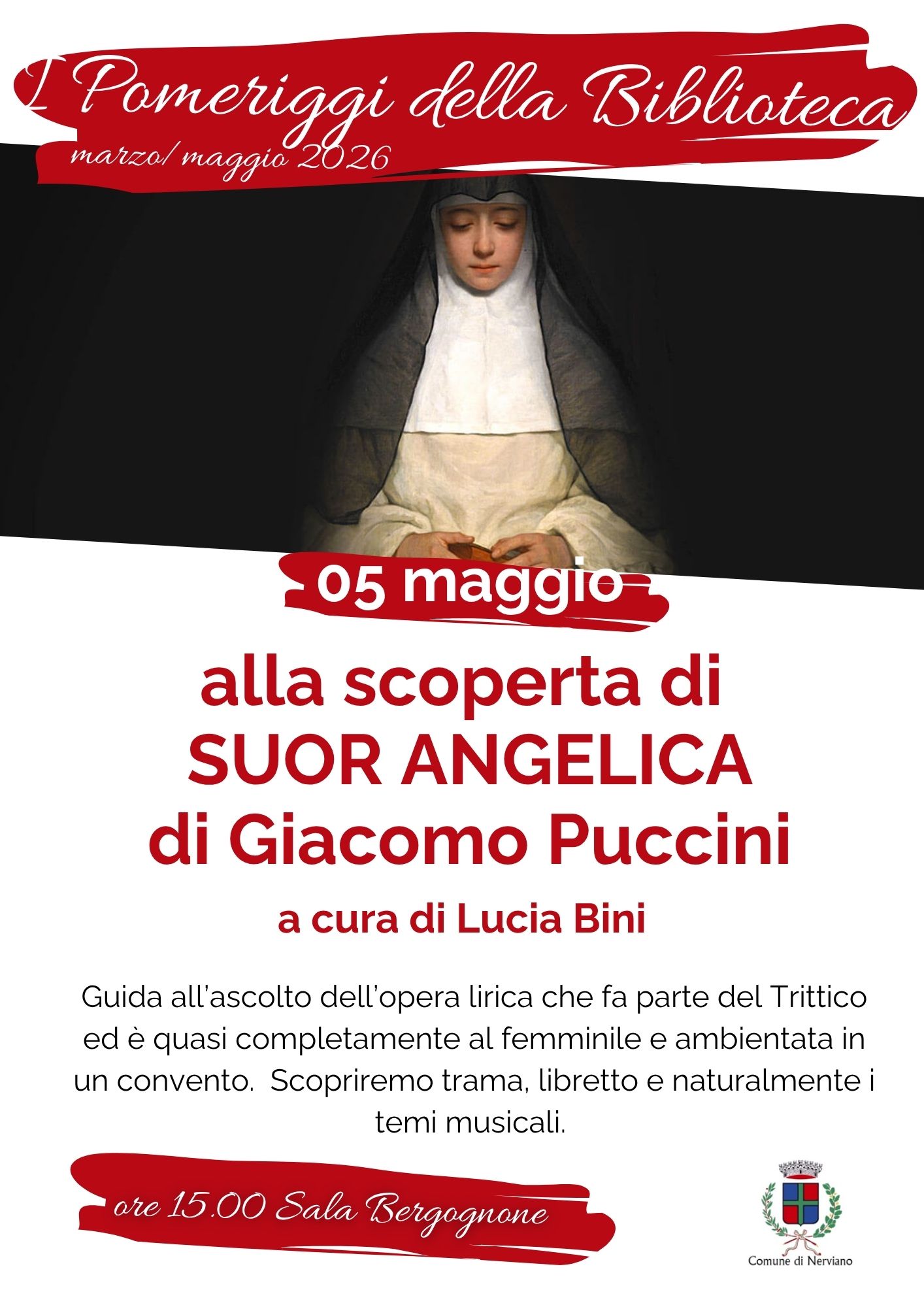 Martedì 5 maggio 2026, alle ore 15.00 in Sala Bergognone, per il ciclo di incontri "I pomeriggi della Biblioteca" Lucia Bini ci guida alla scoperta di "Suor Angelica" di Giacomo Puccini, opera lirica in un atto ambientata in un convento e quasi completamente al femminile. Scopriremo trama, libretto e temi musicali.